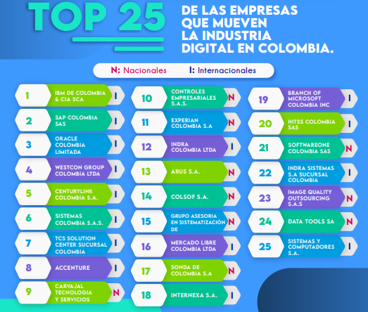 El estudio realizado por Radata by CVN posiciona a 16 empresas extranjeras y 9 compañías nacionales dentro de las más importantes en la industria digital. La industria colombiana es la que domina los ingresos del sector.
